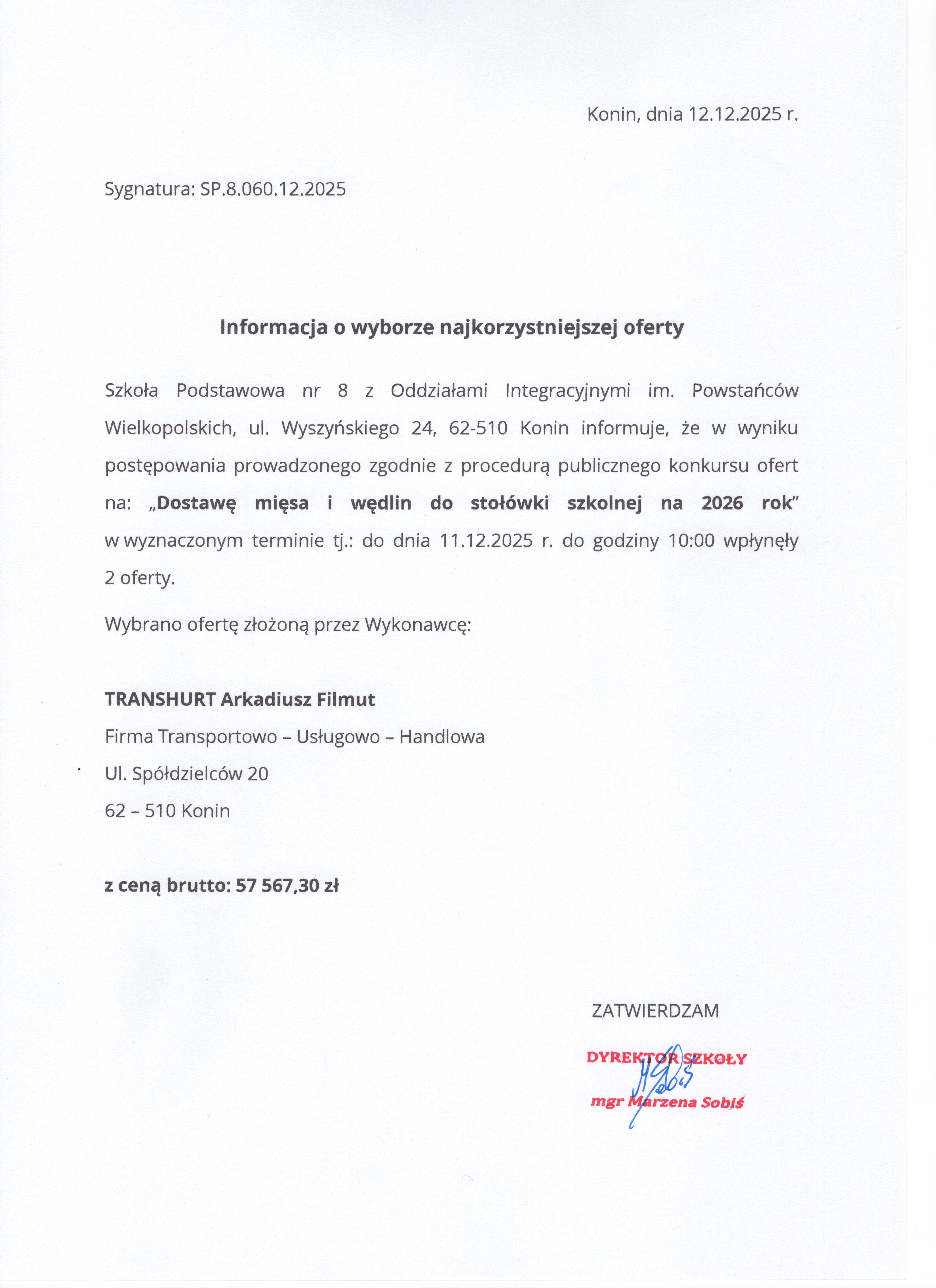 Szkoła Podstawowa nr 8 z Oddziałami Integracyjnymi im. Powstańców Wielkopolskich, ul. Wyszyńskiego 24, 62-510 Konin informuje, że w wyniku postępowania prowadzonego zgodnie z procedurą publicznego konkursu ofert na: „Dostawę mięsa i wędlin do stołówki szkolnej na 2026 rok” w wyznaczonym terminie tj.: do dnia 11.12.2025 r. do godziny 10:00 wpłynęły 2 oferty.